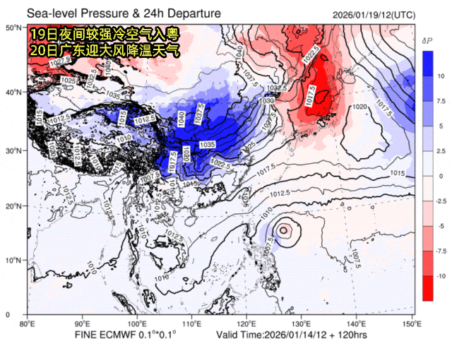 较强冷空气前锋将于20日早晨影响粤北,傍晚前后影响中部,夜间影响南部沿海。