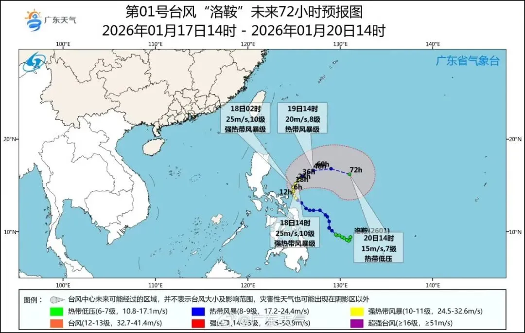 据@广东天气最新消息,1月17日14时,今年第1号台风“洛鞍”中心位于菲律宾马尼拉偏东方向约440公里的洋面上,也就是北纬13.9度、东经125.0度,中心附近最大风力10级(25米/秒),中心最低气压为985百帕。