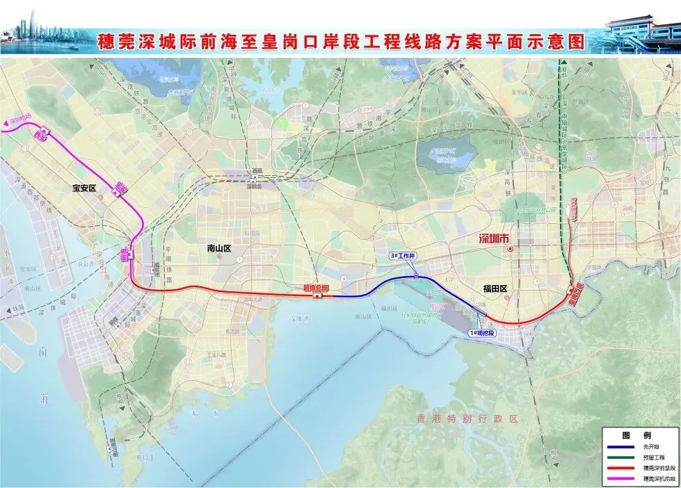 穗莞深城际铁路划分三期建设:广州新塘至深圳机场段(2019年12月已开通运营);深圳机场至前海段(简称“机前段”);前海至皇岗段(简称“前皇段”)。