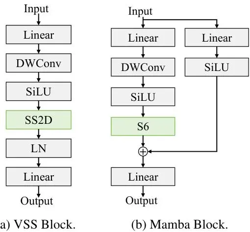 这一支是Mamba的“本职工作”。它使用了一个名为VSS块(Visual State Space block)的模块,其核心是二维选择性扫描(SS2D)。简单说,SS2D会把2D图像特征沿着水平、垂直等四个方向“拉直”成1D序列,然后用Mamba的高效选择性状态空间模型(S6)分别处理这些序列,最后再合并回来。这样,它就能以线性复杂度捕捉图像中任意两个像素间的空间长程依赖。