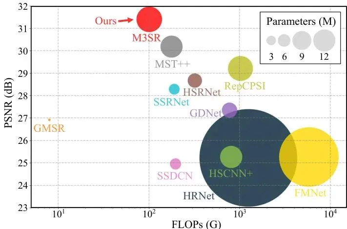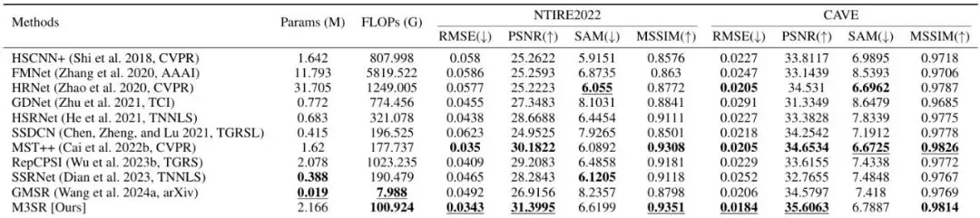 表1:在NTIRE2022和CAVE数据集上的结果。M3SR在NTIRE2022的所有指标(RMSE, PSNR, MSSIM)上都取得了第一,在CAVE数据集的RMSE和PSNR上也拔得头筹。注意看参数量(Params)和计算量(FLOPs),M3SR并非最小,但相比性能接近的MST++等Transformer方法,它的计算成本(100.9G FLOPs vs 177.7G)有显著优势。