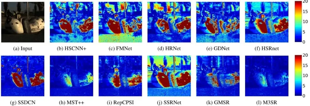 图:M3SR重建的高光谱图像(右)与真实值(中)的绝对误差对比。蓝色越深,说明重建得越准。