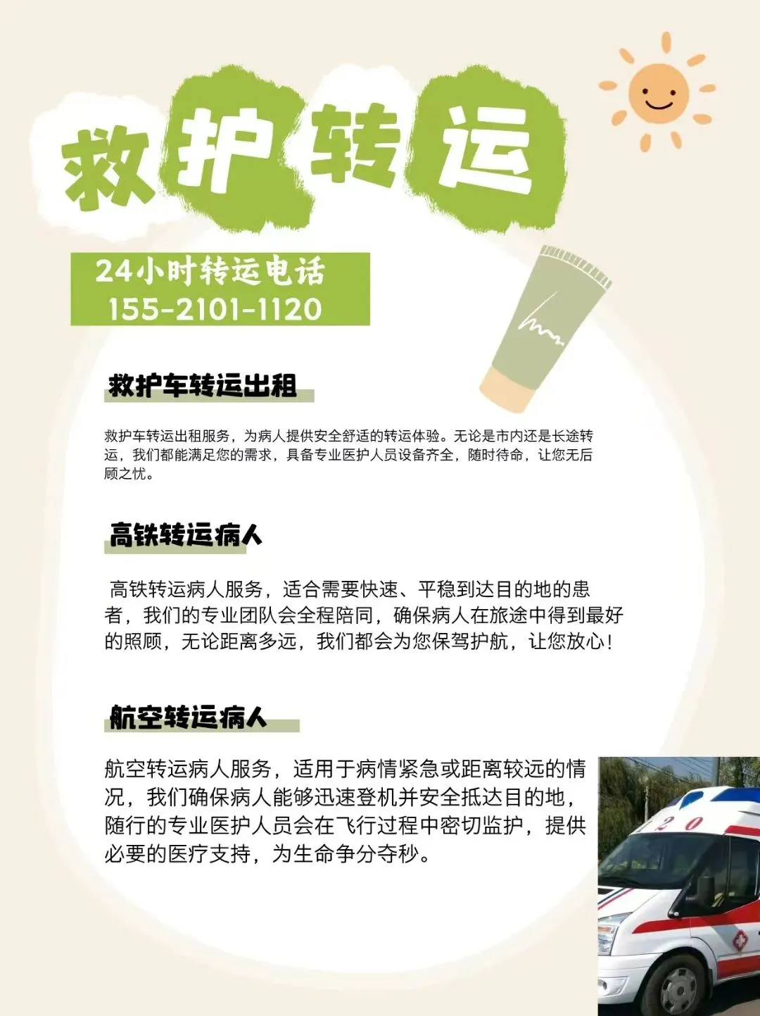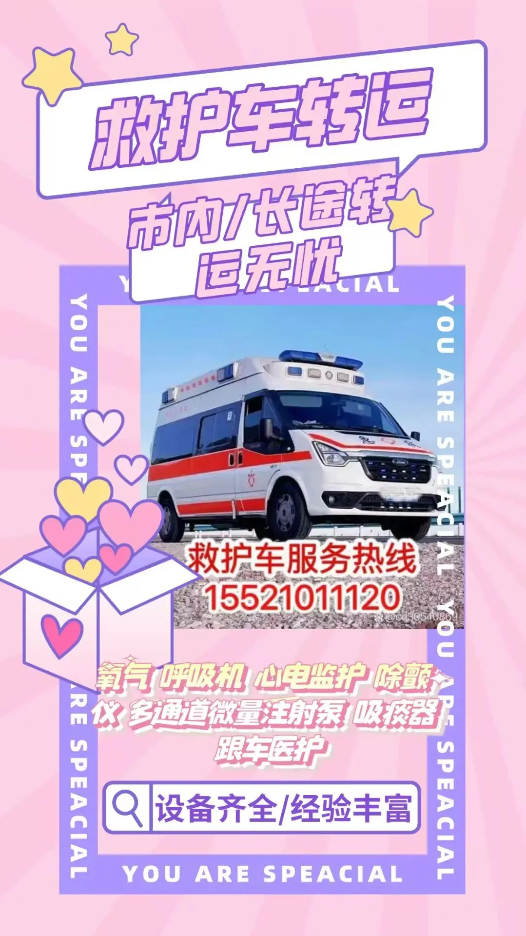 在医疗服务的延伸领域,救护车出租转运服务正成为连接医院、家庭与异地医疗的重要纽带。无论是康复出院的患者、跨省转诊的重症病人,还是大型活动的医疗保障,这项服务以专业、高效的姿态,为生命安全保驾护航,填补了急救 120 资源与普通交通之间的服务空白。? 正规救护车出租转运服务覆盖多元场景,精准匹配不同需求。针对康复出院、跨院转诊、异地返乡等非急救场景,服务提供门到门一站式护送,尤其适合行动不便的老人、术后患者和母婴群体。对于重症患者,配备移动 ICU 级别的监护型救护车,搭载全自动呼吸机、心电监护仪等专业设备,由持证医护人员全程陪护,确保跨省长途转运中的生命体征稳定。此外,服务还延伸至大型赛事、演唱会、商务会议等活动的医疗保障,以及机场、火车站的无缝衔接接送,形成全场景覆盖的转运网络。? 专业配置是服务的核心保障。正规机构的救护车均经严格检测维护,配备经验丰富的司机与医护团队,实行 24 小时响应机制,紧急订单 30 分钟内即可出车。车内医疗设备一应俱全,从制氧机、负压吸引器到智能监护系统,能实时监测患者心率、血氧等关键指标,数据同步至云端供医生远程指导。针对特殊人群,还设有母婴专用救护车(配备保温箱)、防跌倒担架等定制化设施,最大化保障转运安全与舒适。? 选择这类服务时,需优先认准正规资质。应选择经主管部门批准、合法注册的机构,核实车辆与人员资质,明确费用构成避免隐性收费。提前预约可确保资源调配顺畅,长途转运建议签订服务协议并保留相关凭证。规范的服务流程、透明的收费标准与完善的售后保障,让每一次转运都成为安心托付。? 从紧急救援到日常护送,救护车出租转运服务以专业实力架起生命桥梁。它不仅是交通工具的延伸,更是医疗服务的移动载体,用高效响应、专业配置与人文关怀,守护着每一段关乎健康的旅程。?
