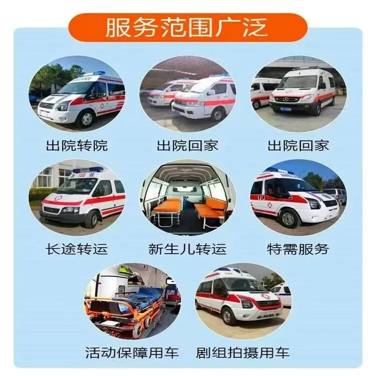 我们是救护车出租转运公司,120救护车接送病人预约护送。24小时为术后康复、危重患者及跨区域就医人群提供专业医疗转运服务,提供120救护车转运出租‖私人120救护车(非急救)‖跨省长途转运‖危重病人转运‖市内转运‖术后康复病人转运‖高铁病人转运‖患者返乡‖大型活动赛事保障‖配备ICU设备:呼吸机▪心电监护仪▪吸痰器•微量泵•氧气▪急救药箱▪专业医护团队