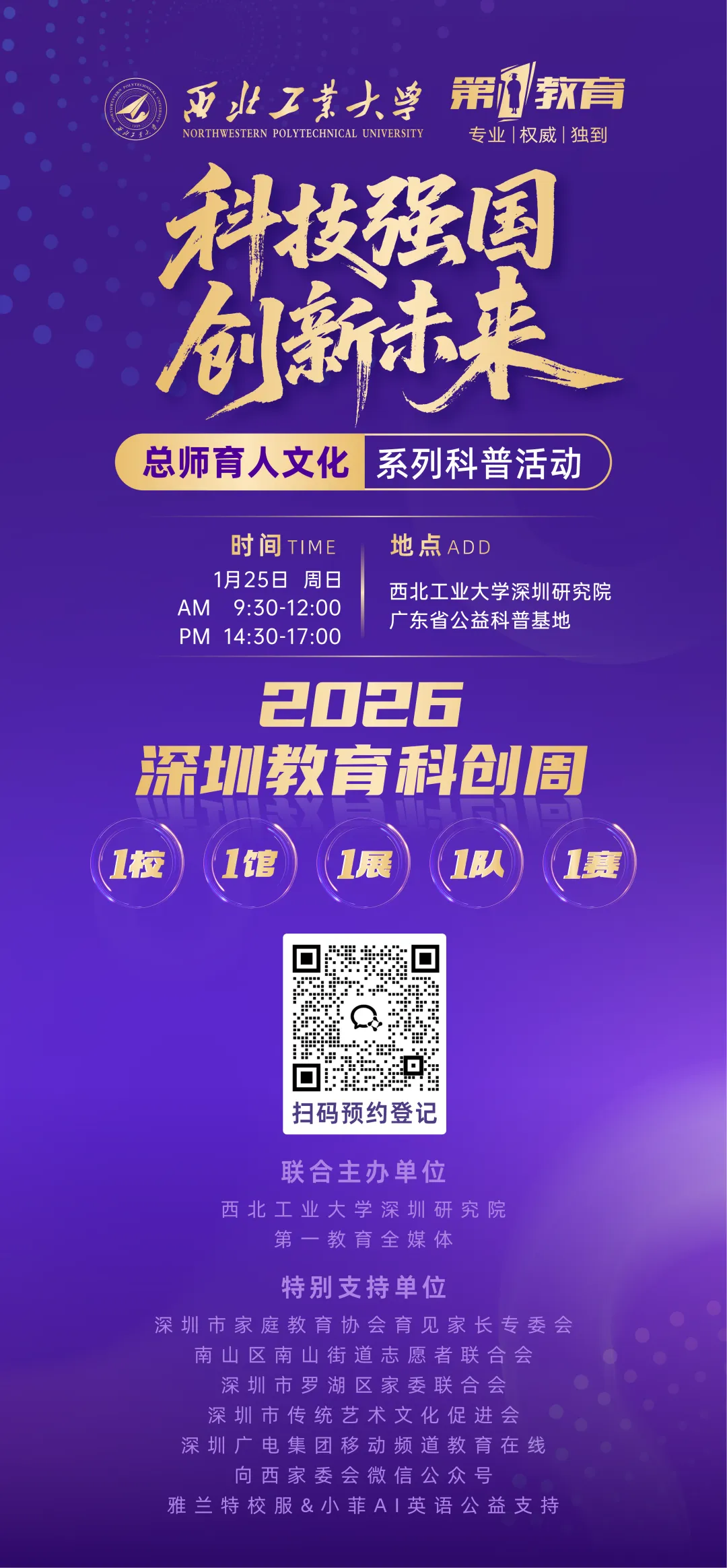 让我们在1月25日相聚北工业大学深圳科普基地,共同感受科技的力量、精神的传承,陪伴孩子在这一方"行走的课堂"里,看见世界,遇见未来。