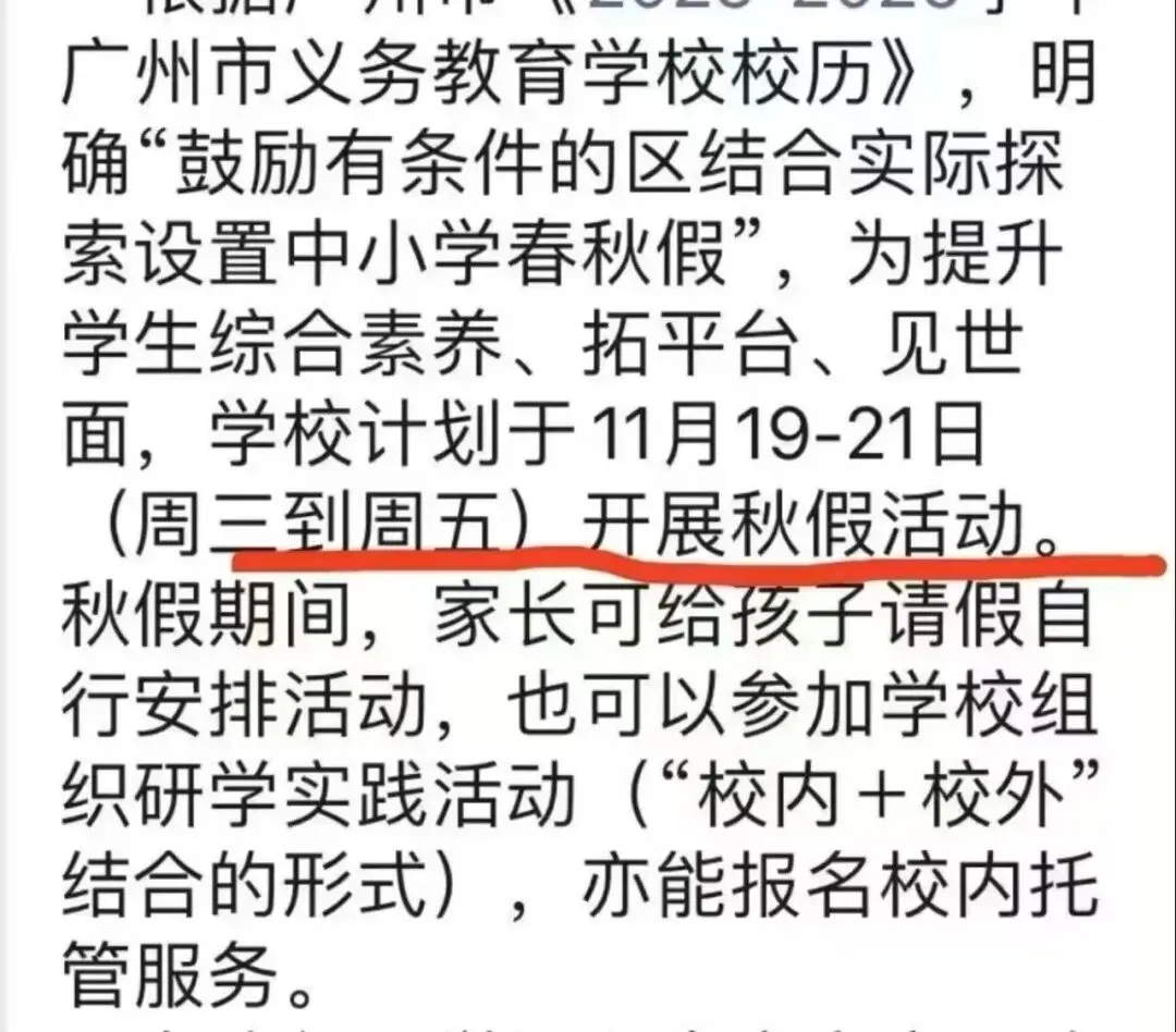 同时明确写到“统筹安排,自主选择”,也就是说,这个不是简单的直接放假,家长可以根据情况自主选择,没有时间带孩子出游的的家长,其实可以跟随学校安排。例如此前玉岩中学(广州公办中学中首个试行春假制度的学校),在今年三月份的春假,就是根据家庭情况自主选择!学生可以自主选择参加学校组织的研学旅行,也可以选择自己跟父母出行。其他学校会否也实行,从目前就政策来看,春秋假并不是硬性安排实施,也就是说鼓励推行,学校自行决定。