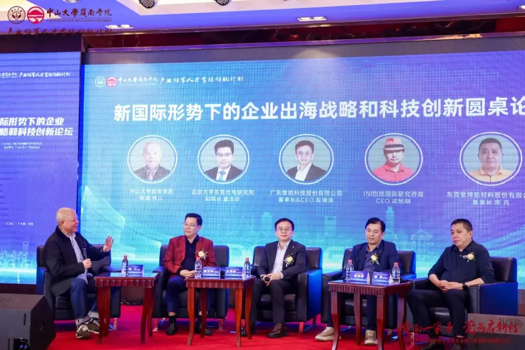 在产业领军人才全球领航计划之“新国际形势下的企业出海战略和科技创新”论坛环节,林江教授,北京大学东莞光电研究院副院长童玉珍教授,企业家代表维锐科技董事长&CEO左湘凌、INI创旭国际研究咨询CEO梁旭朗和东莞金坤新材料股份有限公司董事长陈亮,分别就东莞跨境电商如何“走”出去以及企业出海战略等议题进行研讨交流。