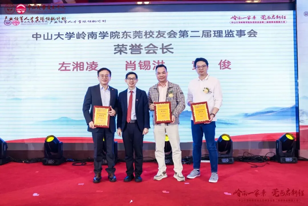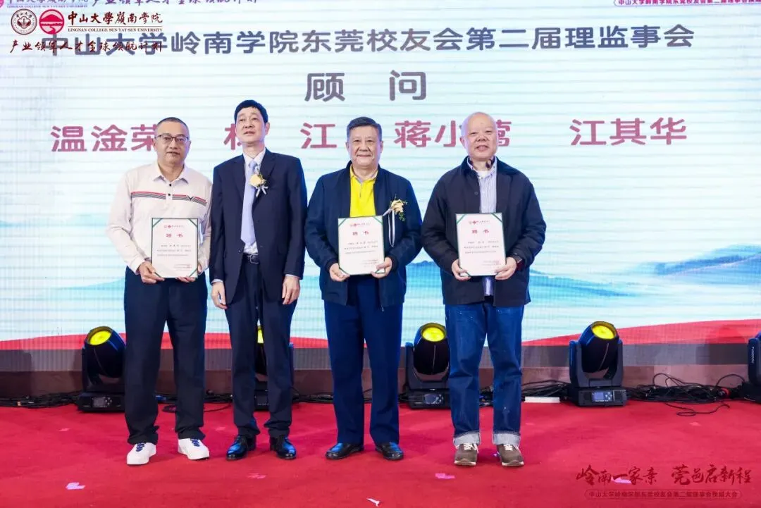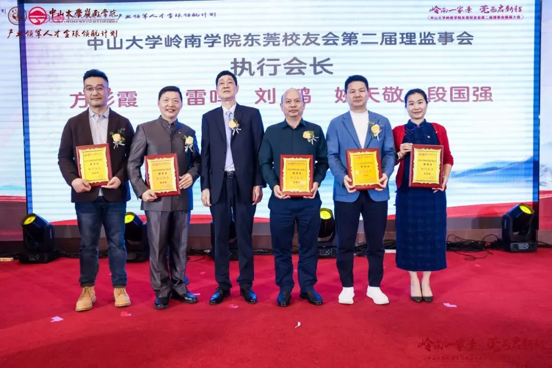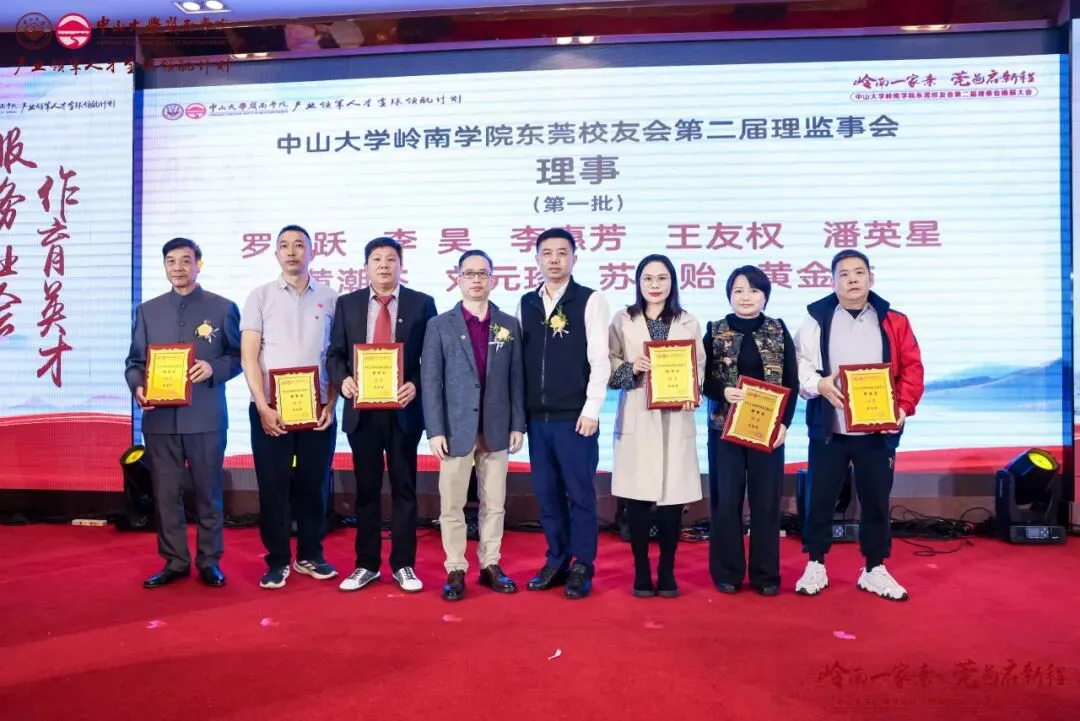 经会议审议及表决,东莞校友会产生了第二届理事会成员,并通过了校友会章程。本届理事会共69位成员,黄卫东校友当选中山大学岭南学院东莞校友会第二届理事会会长,左湘凌、肖锡洪、黄俊校友当选荣誉会长,莫振锻校友当选监事长,王文、王利锋、陈登、汪博士、钟德成、黄小辉、梁健锋校友当选联席会长,方彩霞、马雷鸣、刘鸿、姚天敬、段国强校友当选执行会长,刘蓉芳校友当选秘书长。钟一彪书记为会长、荣誉会长和监事长颁发聘书。阮文杰、黄卫东会长分别为联席会长、顾问、执行会长以及理事会成员们颁发聘书。一纸聘书,承载责任;一份使命,凝聚担当。东莞校友会第二届理事会全体成员将接过这份使命和传承,带领东莞校友会再起征程。