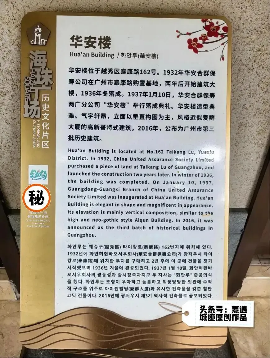 华安楼,建成于1936年,由上海华安合群保寿股份有限公司两广分公司购地建造,“华安”二字的含义即“保中华平安”。
