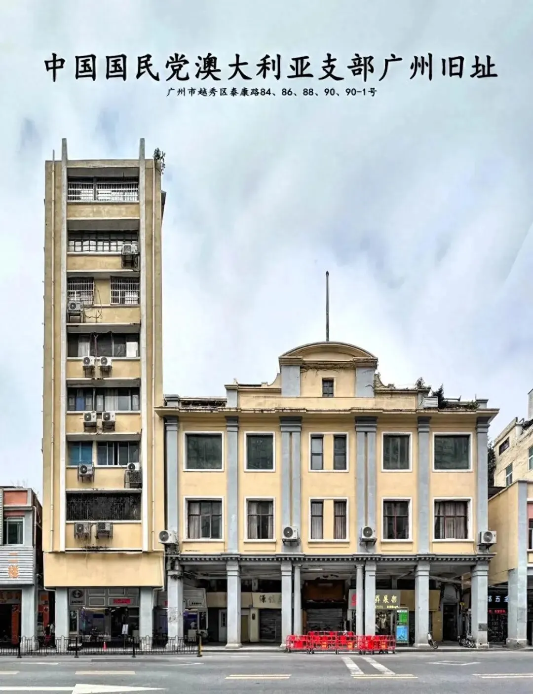 泰康路84号骑楼位于广州北京路历史文化街区,是一栋具有重要历史价值的近代建筑,高四层、五开间,门牌号为泰康路84、86、88、90、90-1号,建成于1931年,占地面积约300平方米。
