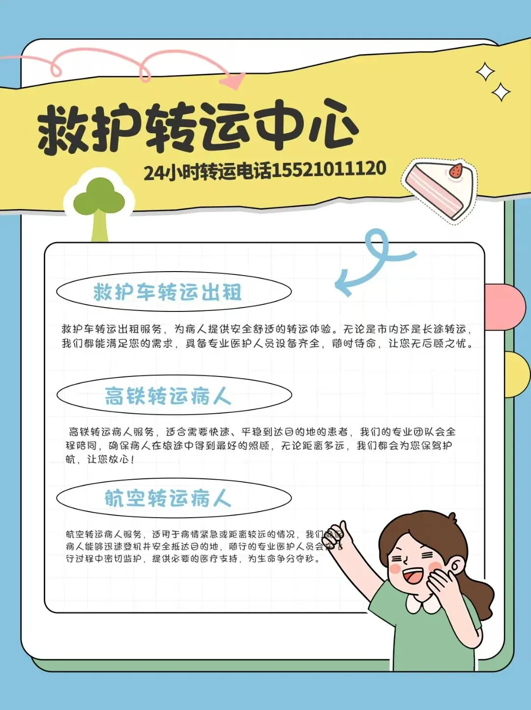 紧急医疗转运:针对突发疾病、交通事故等紧急情况,提供快速、安全的救护车转运服务。