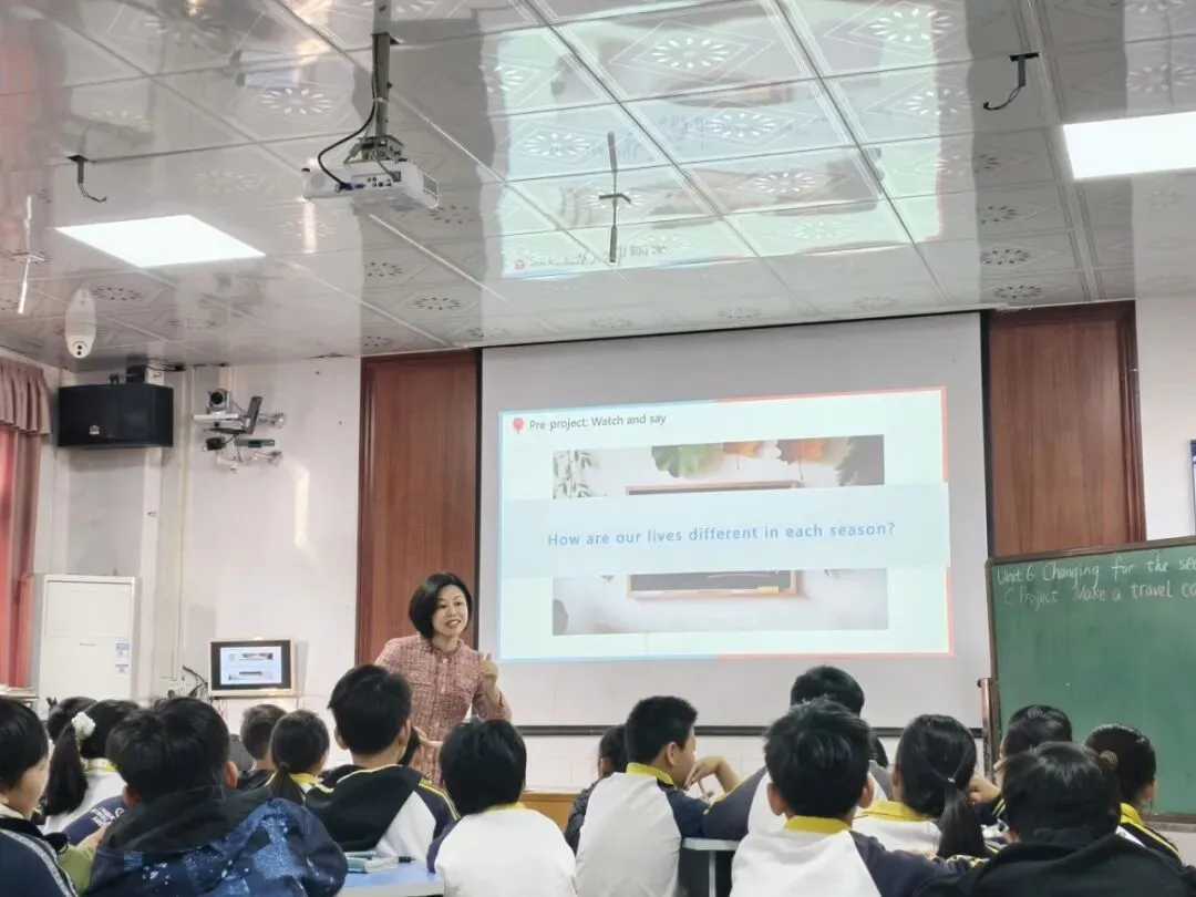 活动首先由莞城平乐坊小学老师叶滢珏展示课例PEP四年级上册《Unit 6 Changing for the seasons Project》。课堂以“制作旅行卡”为核心任务,融合季节词汇、衣物表达与句型运用,通过小组合作完成分类、讨论、创作等环节,直观呈现“学 — 思 — 用” 教学理念,为我镇教师提供了借鉴经验。
