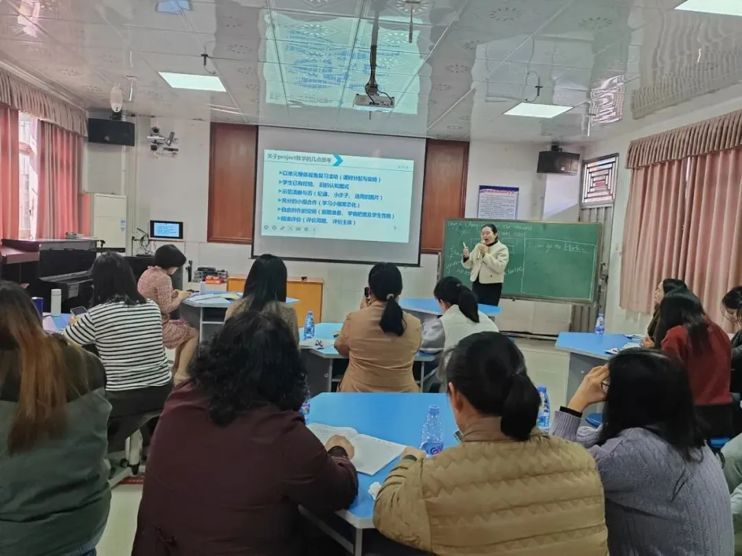 活动中,莞城教研管理中心教研员朱晓岚先引导参会教师分组研讨,围绕Project板块功能、问题链设计、教学阶段划分及评价作用四大核心问题交流碰撞。随后,朱晓岚结合课例作“基于主题意义探究的小学英语项目式学习”专题讲座,从教材解读、学情、流程设计三个维度,拆解Project板块“准备—进行—完成—改进”四步教学法,提供实用教学方法。