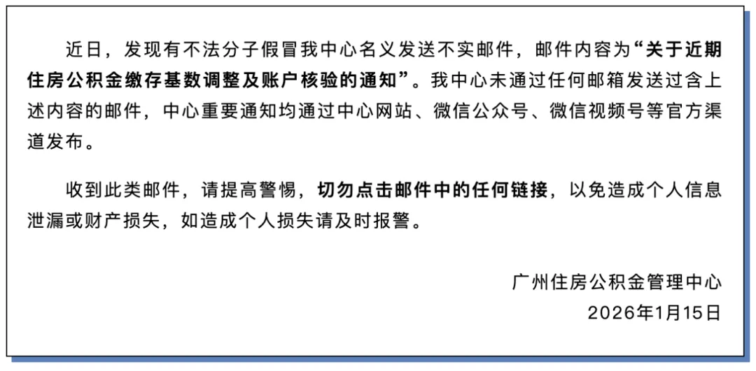 1月15日晚,广州住房公积金管理中心发布关于假冒中心名义发送不实邮件严正声明,具体如下: