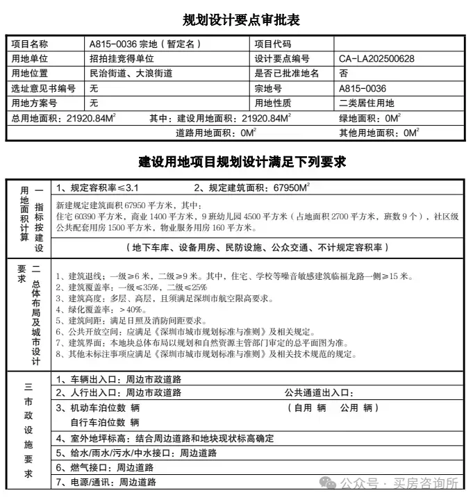 其中,A815-0036宗地面积约21920.84㎡,规定容积率≤3.1,建筑面积约67950㎡,包括:住宅60390㎡、商业1400㎡、幼儿园4500㎡(9班)等。