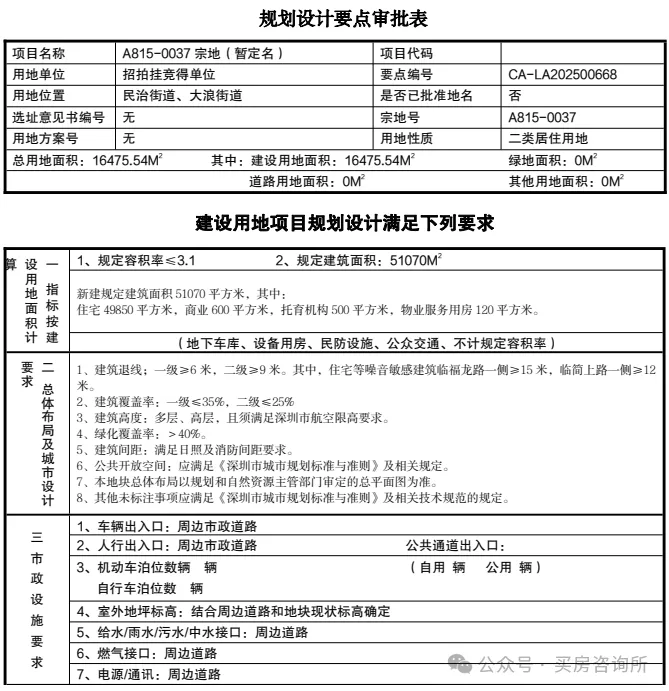 A815-0037宗地,土地面积16475.54㎡,规定容积率≤3.1,规定建面约5.1万㎡,包:住宅49850㎡,商业600㎡,以及托育机构、物业服务用房等。此外,需配置场地面积不小于 560 ㎡的社区体育活动场地和不小于 600 ㎡的社区儿童游戏场地。