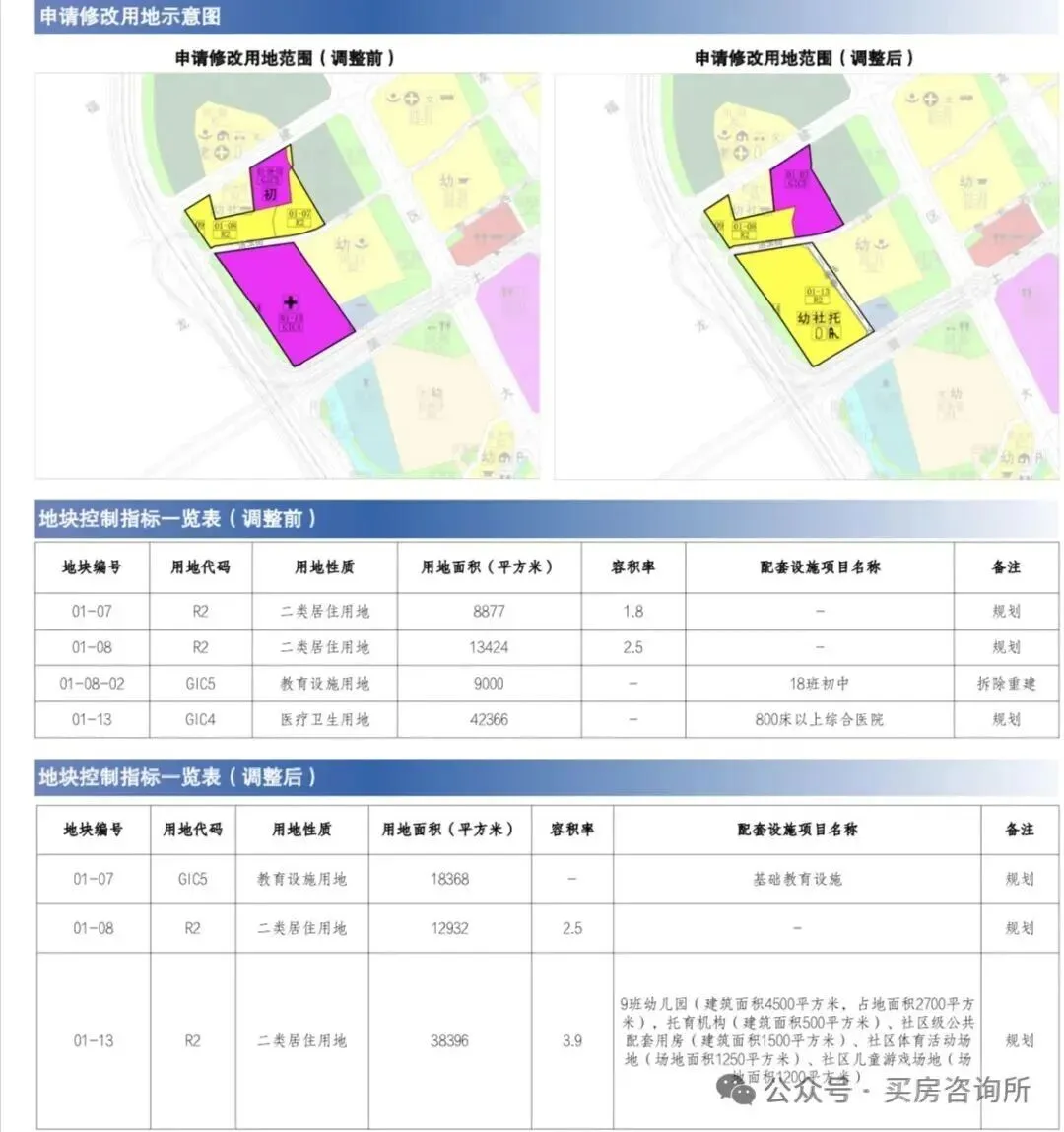 01-13地块用地面积由42366平方米调整为38396平方米,用地性质由医疗卫生用地(GIC4)调整为二类居住用地(R2),容积率由“-”调整为“3.9”,配套项目名称由“800床以上综合医院”调整为“9班幼儿园(占地面积2700平方米,建筑面积4500平方米),托育机构(建筑面积500平方米)、社区级公共配套用房(建筑面积1500平方米)、社区体育活动场地(场地面积1250平方米)、社区儿童游戏场地(场地面积1200平方米)”,备注“规划”其中1-13也是现在即将土拍的A815-0036地块