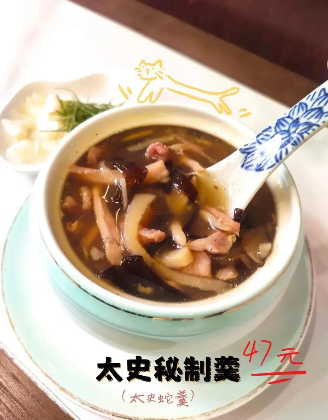 经过江太史这次拜访,市井小巷里上不了台面的蛇羹就此登上了大雅之堂,入得筵席,成了太史家宴上的一道佳肴。太史蛇羹,就此诞生。