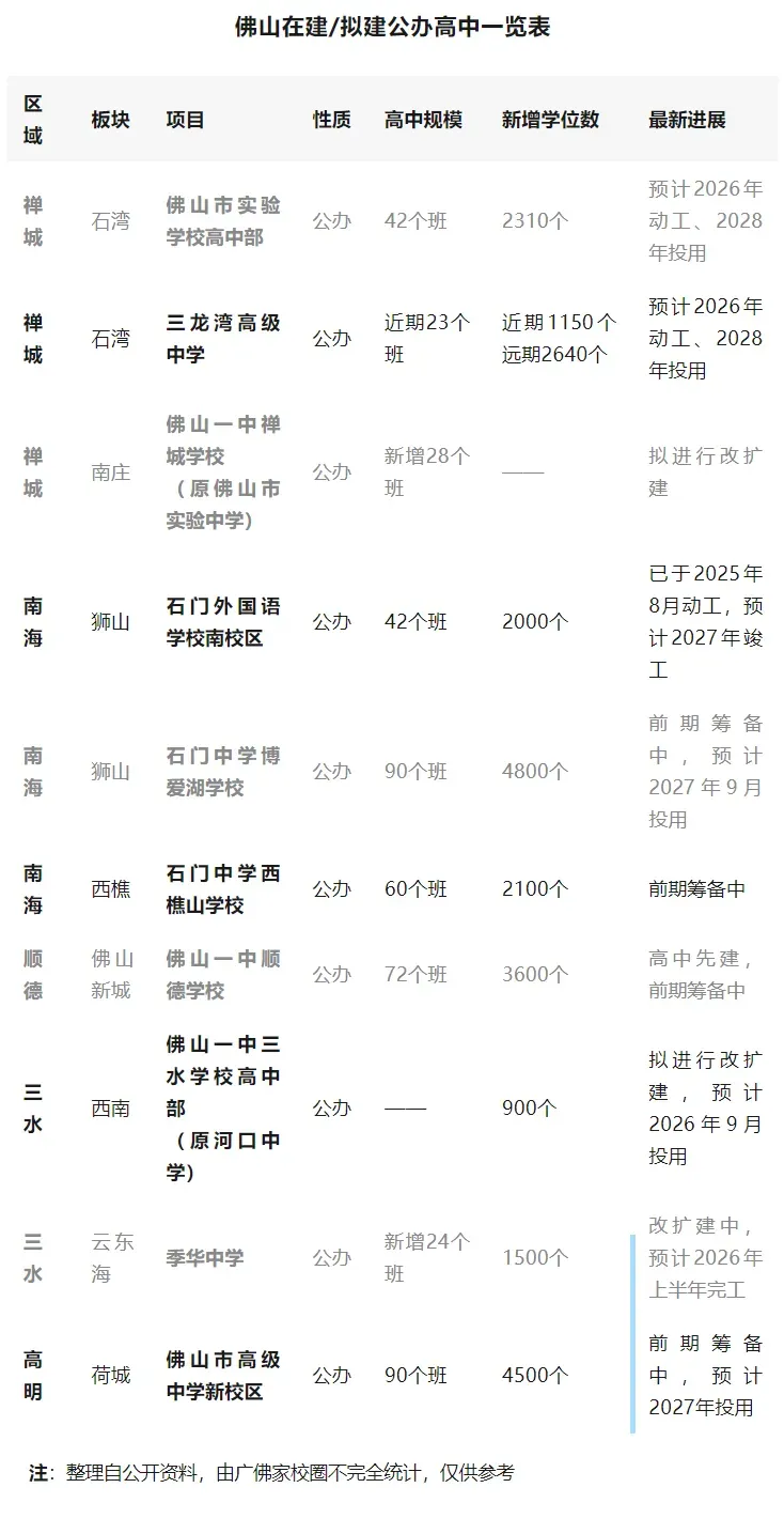 从各区推进情况看,2025 年下半年以来,佛山已进入公办高中建设的集中启动期: