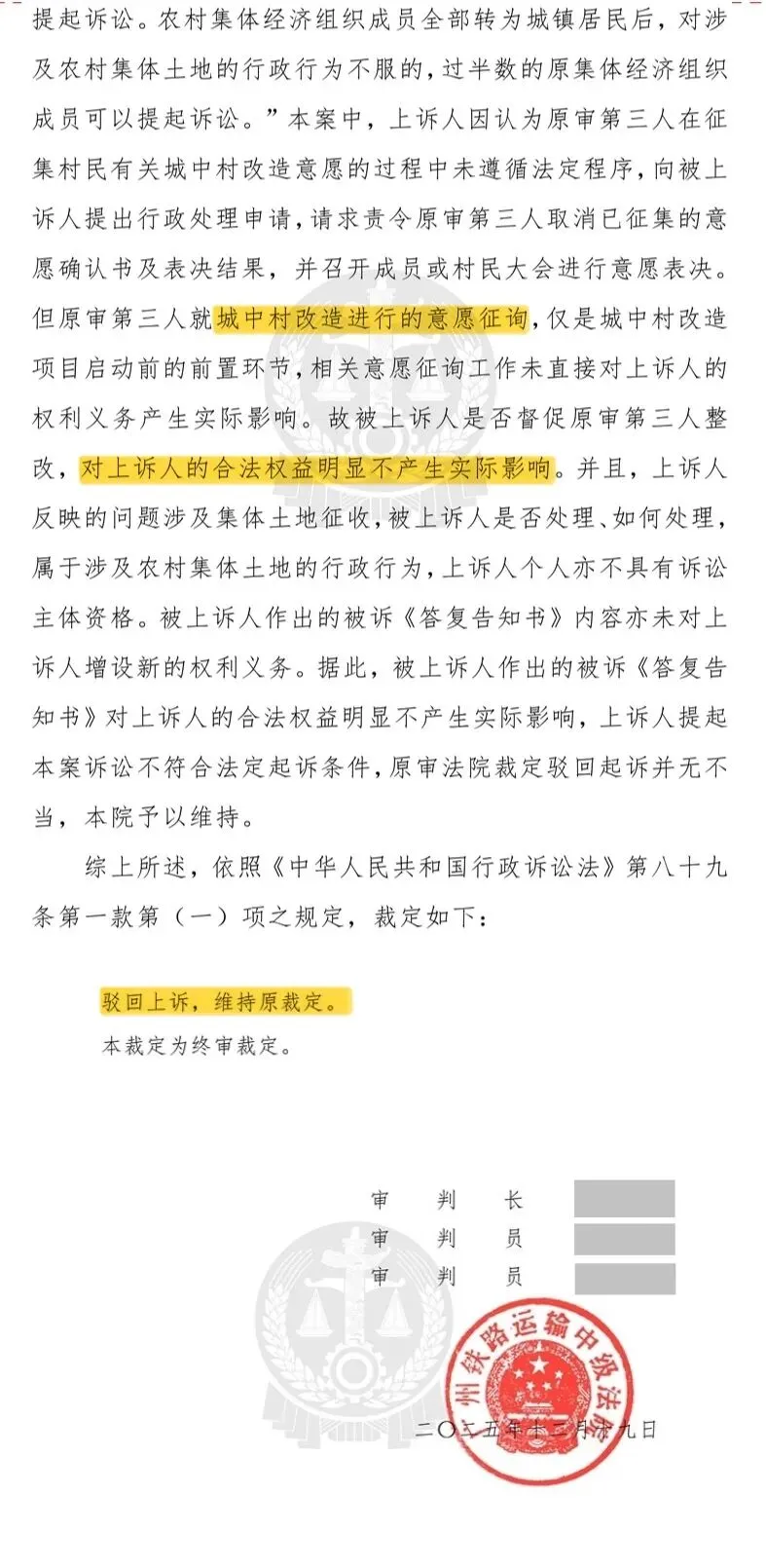 此外,对于违法征地问题、围蔽、拆除违法问题、民主决策程序违法问题的起诉,裁定书也都依据相关条例一一驳回。