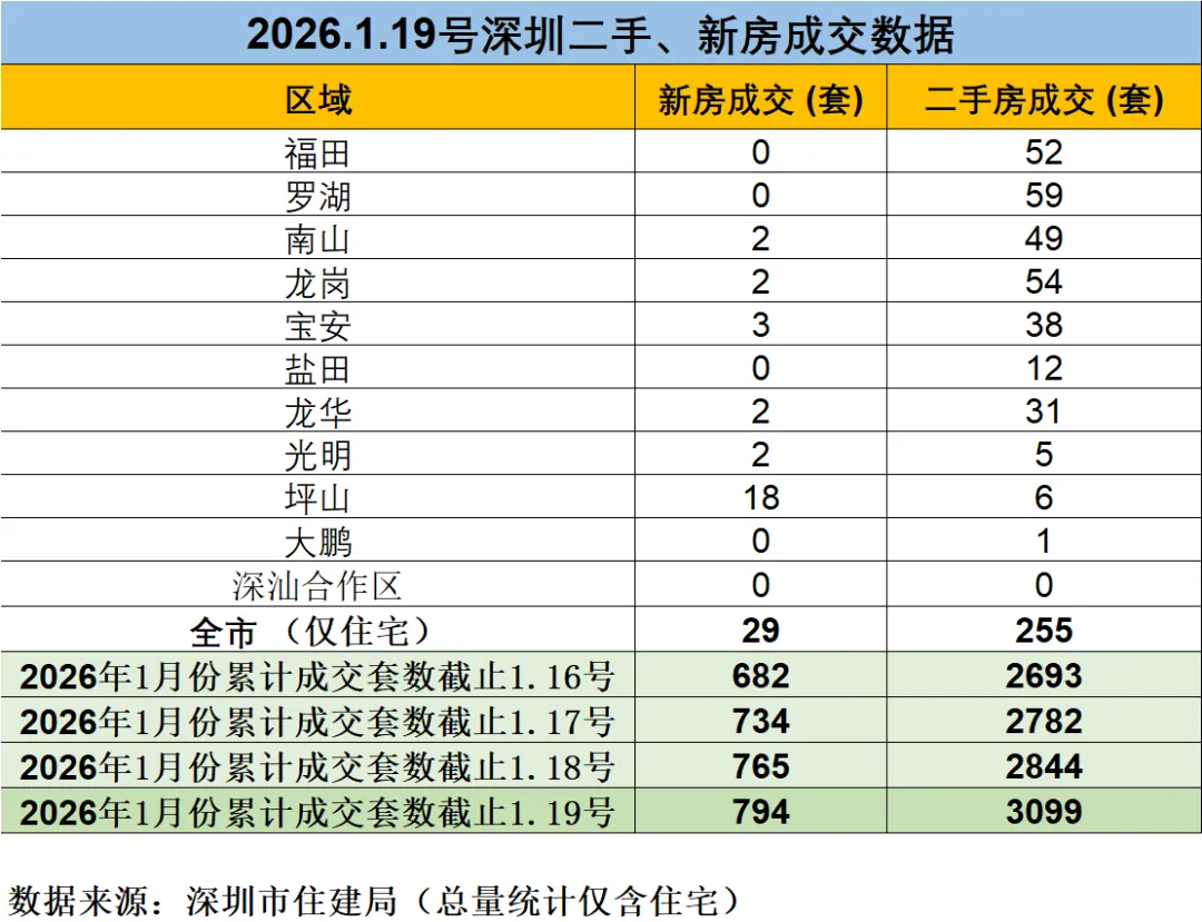 >2026年1月19号深圳二手房、新房成交数据