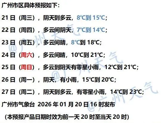 20日—22日,冷空气携带湿区南下,广东大部云量增多,韶关、清远北部有分散小雨,高海拔山区有雨夹雪或冻雨。23日起阳光增多。