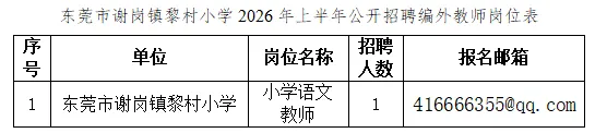 - 符合本公告及《东莞市谢岗镇黎村小学2026年上半年公开招聘编外教师岗位表》(以下简称《岗位表》)所规定的资格条件。