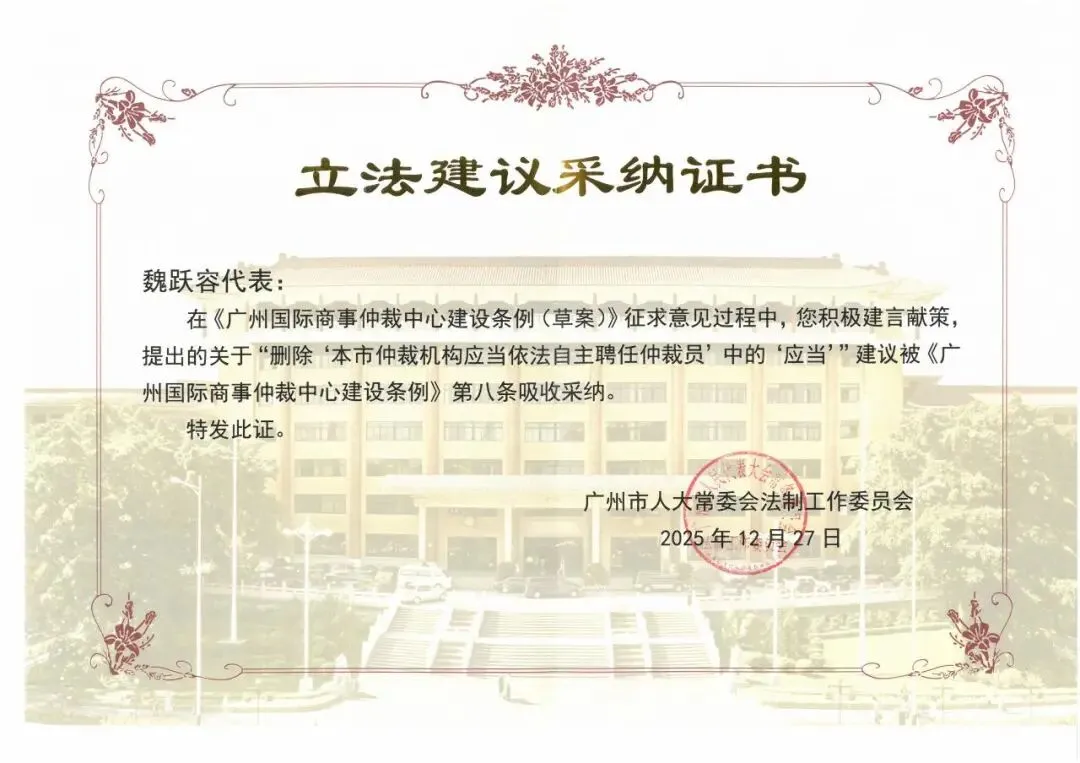 延伸阅读:2025年12月,广州市十六届人大常委会第四十四次会议表决通过《广州国际商事仲裁中心建设条例》,待省人大常委会批准后公布实施。《条例》对仲裁机构建设、国际商事仲裁中心资源集聚、机制对接与规则适用、仲调衔接与工作保障等内容作出明确规定,为提升广州仲裁国际竞争力和影响力、建设国际一流仲裁机构提供坚实制度支撑。