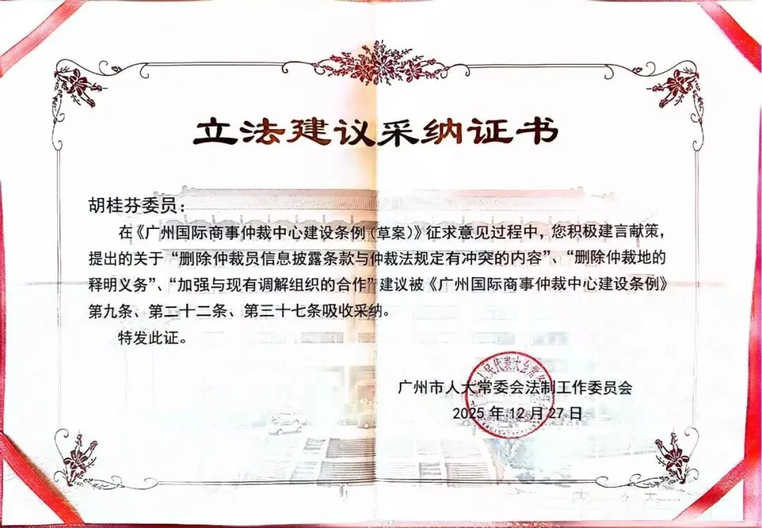 市人大代表魏跃容提出的关于“删除‘本市仲裁机构应当依法自主聘任仲裁员’中的‘应当’”建议被《广州国际商事仲裁中心建设条例》第八条吸收采纳。市政协委员胡桂芬提出的关于“删除仲裁员信息披露条款与仲裁法规定有冲突的内容”、“删除仲裁地的释明义务”、“加强与现有调解组织的合作”建议被《广州国际商事仲裁中心建设条例》第九条、第二十二条、第三十七条吸收采纳。市政协委员徐科飞提出的关于“建立国际仲裁人才库和仲裁员培训基地,推动与境内外高校、国际仲裁机构合作,实施仲裁员职业化培养计划”建议被《广州国际商事仲裁中心建设条例》第十七条吸收采纳。