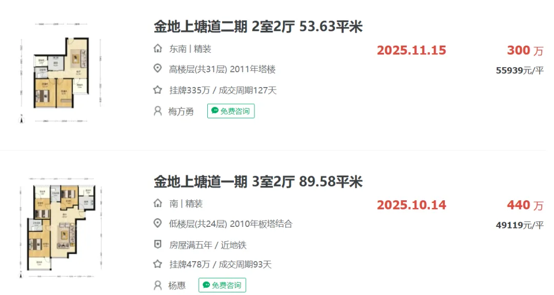金地上塘道去年11月成交一套53.63平户型,成交总价约300万,折合单价约55939元/㎡,10月成交一套约89.54平户型,成交总价约440万,折合单价约49119元/㎡。