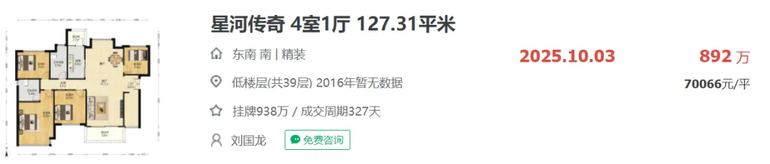 去年10月项目附近的星河传奇成交一套127.31平户型,成交总价约892万,折合单价约70066元/㎡。