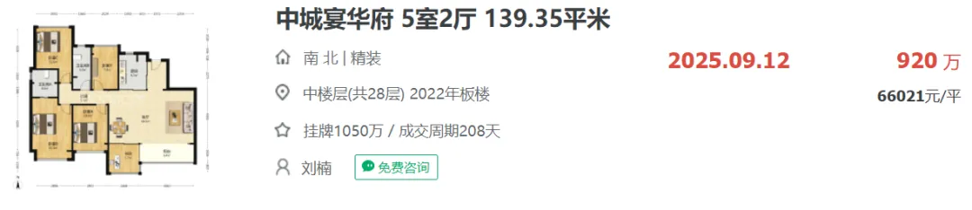 去年10月项目附近的中城宴华府成交一套139.35平户型,成交总价约920万,折合单价约66021元/㎡