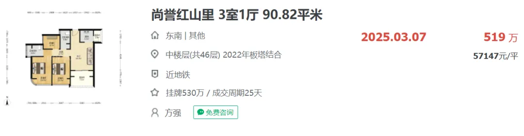 项目附近2021年开盘的尚誉红山里,去年3月成交一套90.82平户型,成交总价约519万,折合单价约57147元/㎡。