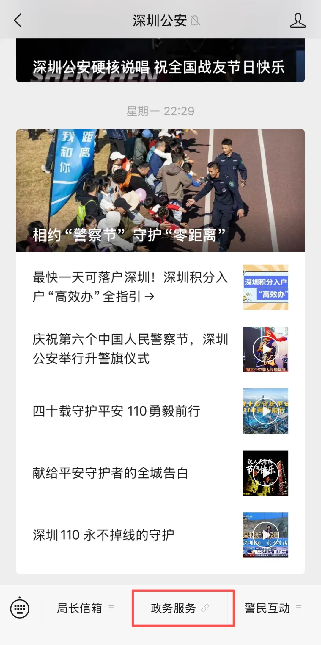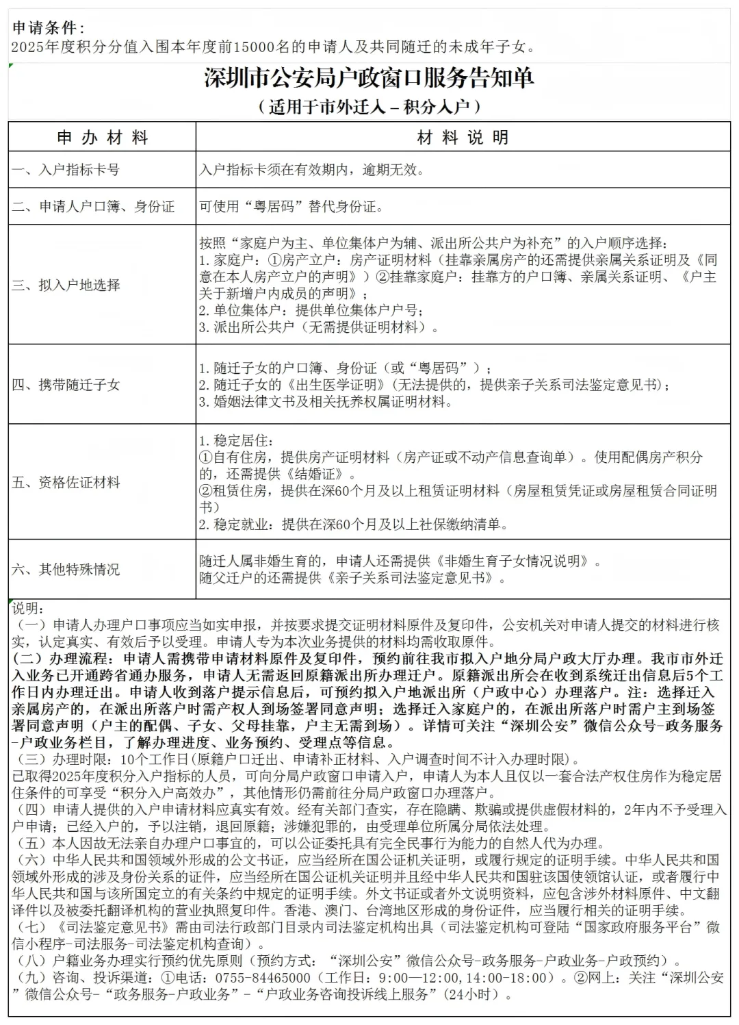 关注“深圳公安”微信公众号,在“政务服务—户政业务—户籍迁入—市外迁入—积分入户—我要落户”栏查看落户指引,了解入户指标卡信息,入户材料及办理流程等服务。