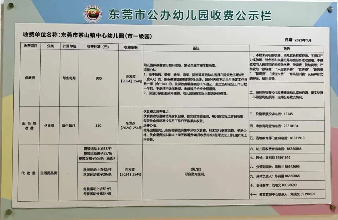 您好!为了让大家更清楚地了解幼儿园收费标准,我园依据东莞市《关于加强学校教育收费公示管理工作的通知》(东发改[2024]254号)的相关规定,对幼儿园的收费标准公示如下,请您知悉。