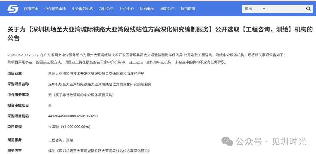 深大城际,起于深圳机场,终至惠州大亚湾,全线14站,设计时速每小时160公里。建成后,市民往来深惠双城通行将更为便捷,也将为推动深惠两地经济发展注入新的动力。其中,深大城际深圳机场至坪山段工程,是国家发展改革委批复的《粤港澳大湾区(城际)铁路建设规划》的重点项目。 近期,惠州大亚湾经济技术开发区管理委员会交通运输和海洋经济局发布关于为【深圳机场至大亚湾城际铁路大亚湾段线站位方案深化研究编制服务】公开选取【工程咨询,测绘】机构的公告。 服务内容:编制《深圳机场至大亚湾城际铁路大亚湾段线站位方案深化研究》, 服务时限说明:合同签订后90个自然日完成《深圳机场至大亚湾城际铁路大亚湾段线站位方案深化研究》 选取的中介服务机构:苏交科集团股份有限公司,中铁第四勘察设计院集团有限公司,华设设计集团股份有限公司全文完,随手转发可以让更多人了解深圳地铁、学校、公园及重大工程规划、建设动态;重点关注深圳东部城市更新规划、建设及深圳都市圈一体化发展进展;分享深圳游玩打卡攻略。
