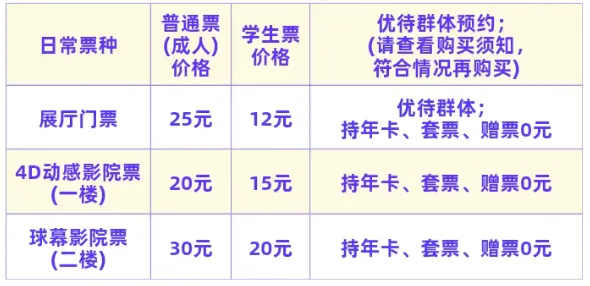 4、免费开放日参观范围仅限于常设科普展厅(负一层至三层,温馨提示:二楼信息与高新技术展厅信息科技基础展区于2025年11月18日起进行改造施工。为确保安全,施工期间对该区域进行封闭,暂停开放),4D动感影院和IMAX球幕影院按规定收费,具体票价👇