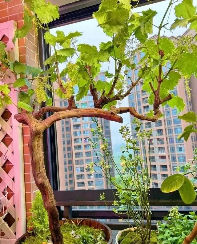 葡萄养成盆景了 , 粗粗的枝干 , 几根枝蔓爬上去 , 开着花 , 等夏天就能吃。 盆栽能养成这样 , 下了功夫的。