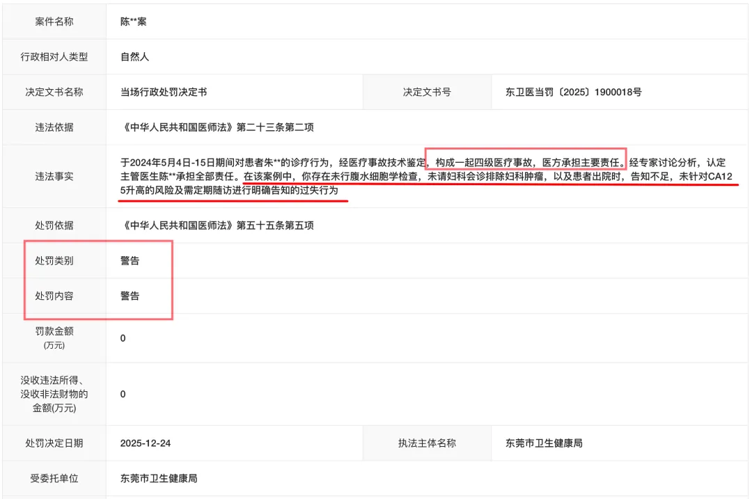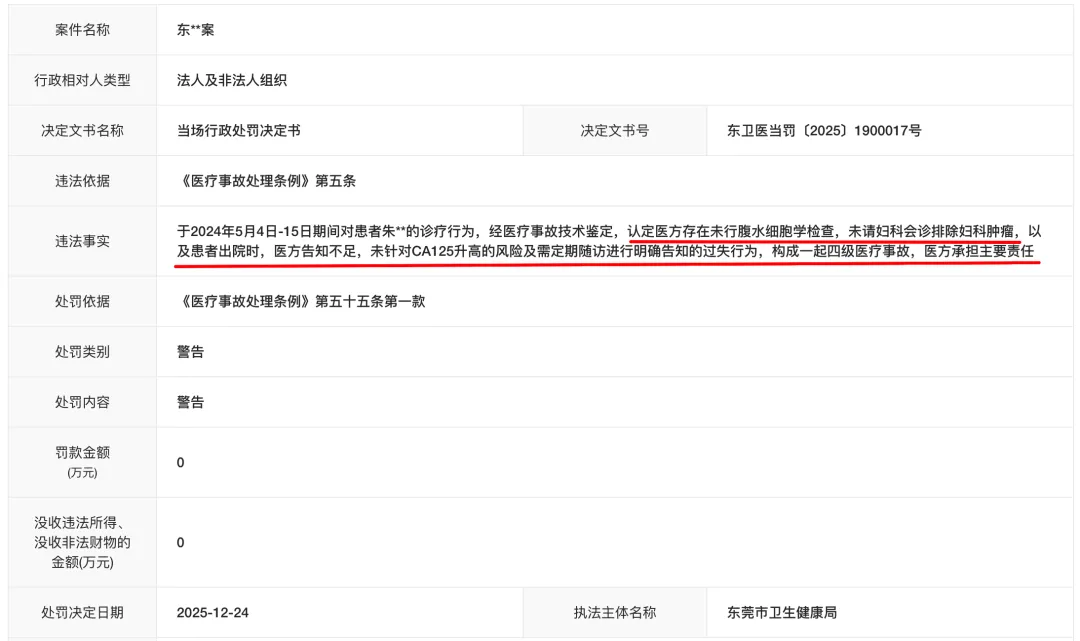 今天的医疗事故行政处罚案例,东莞市卫生健康局在2025年12月24日才做出行政处罚决定。