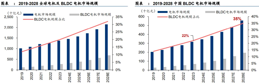 因此,BLDC电机市场规模持续增长。据Frost&Sullivan数据,2028年全球/中国BLDC电机市场规模分别将达6869、1946亿元,年复合增速为20%/23%,在整体电机市场占比也将提高。