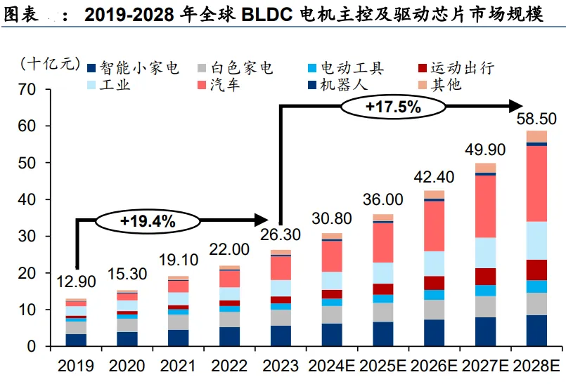 在BLDC电机市场增长下,预计2028年全球BLDC电机主控及驱动芯片市场规模将达585亿元,其中,汽车、电动工具及机器人,增速更快。