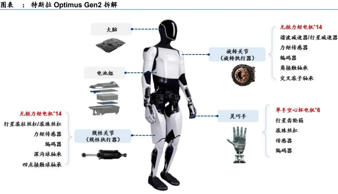而Optimus Gen2的方案中,每只灵巧手有6个电机,主要为BLDC电机,预计Optimus Gen3版本,每只灵巧手电机数量有望增至17个。