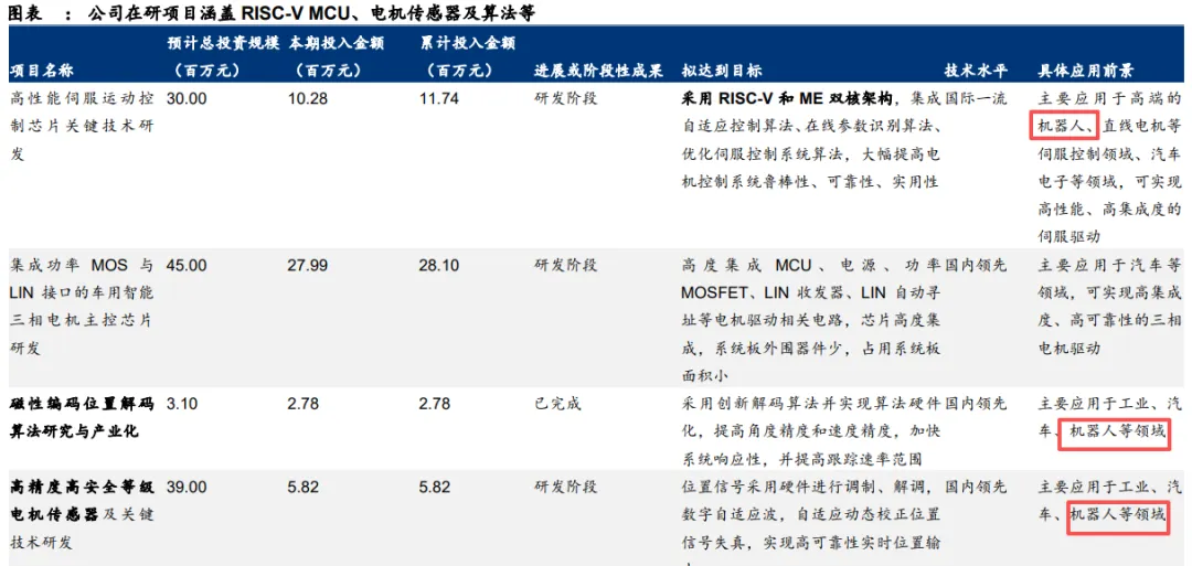 而公司在研项目中,正研发用于高端机器人的高性能伺服运动控制芯片,以及用于机器人的高精度等级电机传感器。