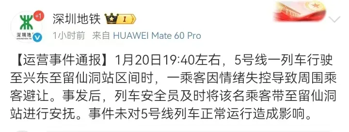 1月20日晚,@深圳地铁 发布运营事件通报: