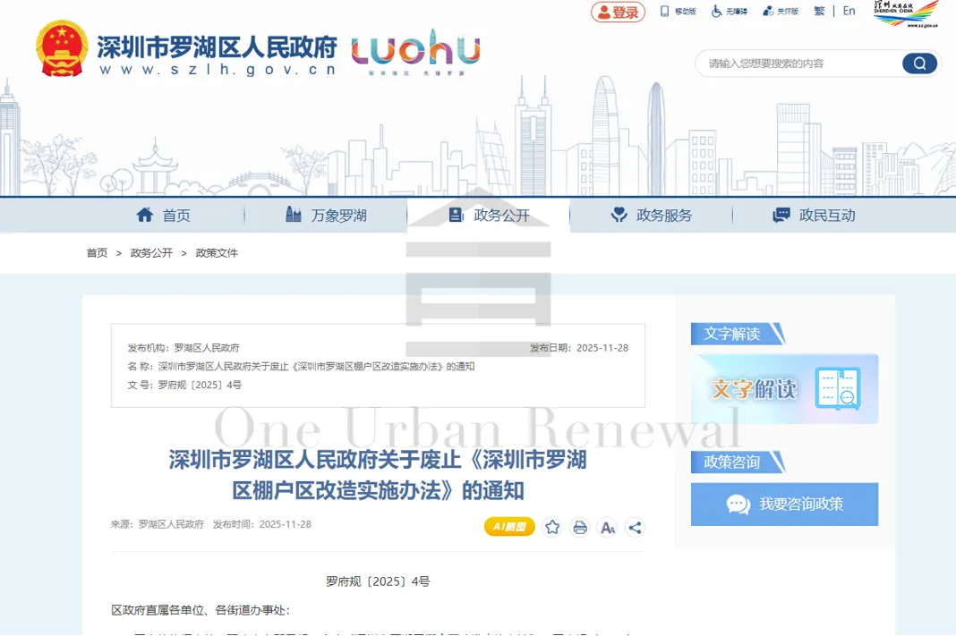 通知内容:2025年11月28日,深圳市罗湖区人民政府关于废止《深圳市罗湖区棚户区改造实施办法》的通知。