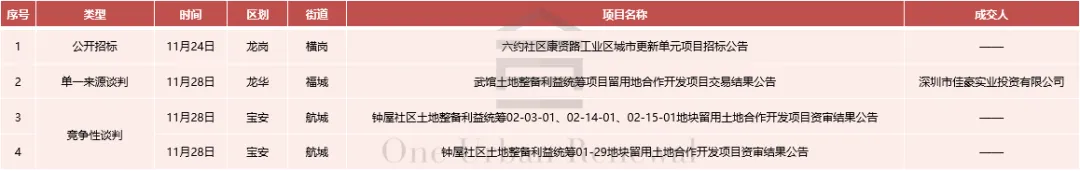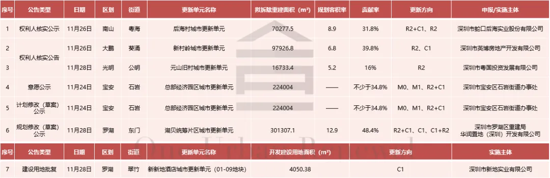 2025年第48周,深圳市共发布拆除重建类权利人核实公示1项,权利人核实公告2项,意愿公示1项,计划修改(草案)公示1项,规划修改(草案)公示1项,建设用地批复1项,土地整备类公示2项,法定图则调整1项,集体资产交易4项。