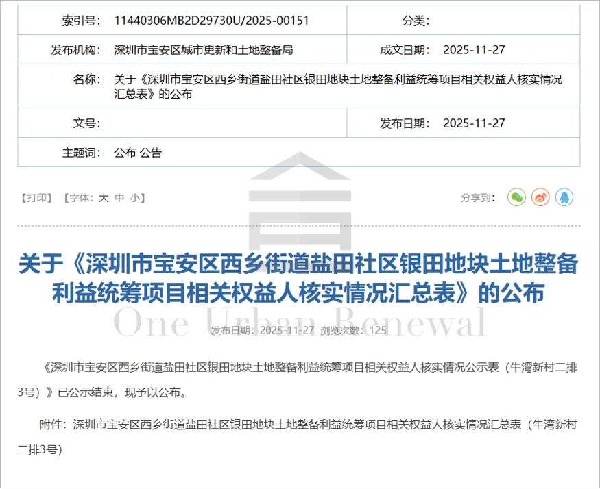 宝安区西乡街道盐田社区银田地块土地整备利益统筹项目权利人核实公告