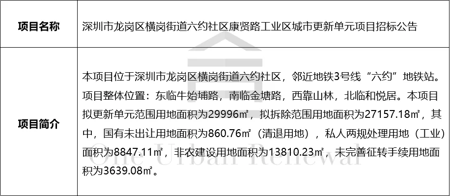 深圳市龙岗区横岗街道六约社区康贤路工业区城市更新单元项目招标公告