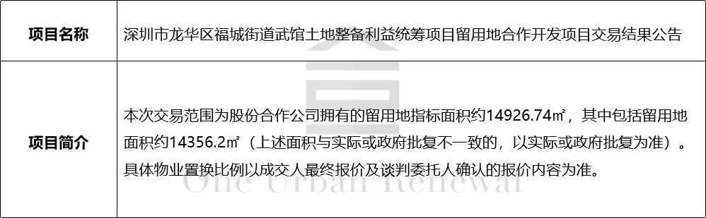 深圳市龙华区福城街道武馆土地整备利益统筹项目留用地合作开发项目交易结果公告