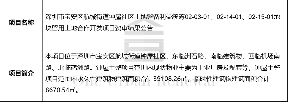 深圳市宝安区航城街道钟屋社区土地整备利益统筹02-03-01、02-14-01、02-15-01地块留用土地合作开发项目资审结果公告